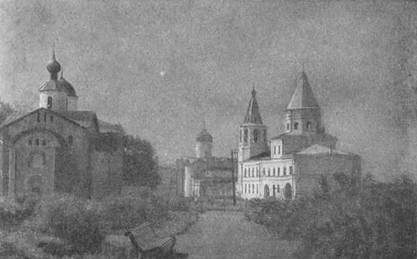К другому славному монастырю Пскова, Снетогорскому, ведет ныне не какой-нибудь мрачный подземный ход, а весьма удобная автобусная линия. В ранний утренний час я оказался единственным пассажиром этого автобуса до Снетной горы. Впервые я видел Снетогорский монастырь не в зелени, а в непривычном мне уборе из снега и морозного инея. Мартовская зорька вызолотила соборный крест. Под обновленными куполами, на карнизах и выступах, присыпанных снежком, сидели нахохленные галки, и снизу казалось, что на барабаны церковных главок накинута горностаевая мантия с черными точечками-хвостами.