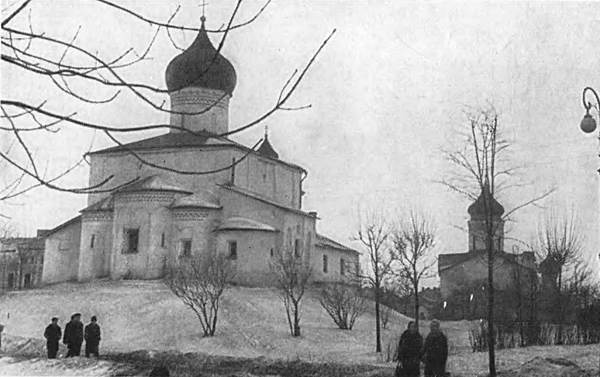 Один из лучших архитектурных памятников Пскова – церковь Василия на Горке. В глубине, справа – церковь Николы со Усохи (то есть у высохшего ручья).