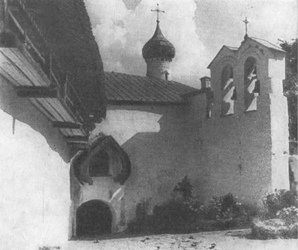 И все же, несмотря на мрачноватую славу, этому старому дому, как и другим псковским сооружениям той поры, нельзя отказать в суровом обаянии. Уж очень величественна эта скупая гладь стен, полное пренебрежение к «узорочью». Строители достигли строгой гармонии в композиции разноэтажных теремов, будто приставленных один к другому.