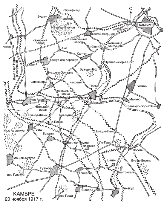 По существу, наступление у Камбре стало для немцев сюрпризом и приобрело характер масштабной операции с намерением прорвать германскую линию Гинденбурга, систему из трех эшелонов широких траншей, расположенных большей частью на противоположных склонах гребней высот, под защитой проволочных заграждений глубиной 50 м и более, в районе к западу от Камбре. Успех зависел от прорыва оборонительных рубежей немцев и взятия неповрежденными мостов у Маньера и Маркуэна. Британские силы, привлеченные для прорыва, состояли из шести пехотных дивизий и девяти танковых батальонов, кавалерийского корпуса и около тысячи орудий различных калибров (а также около 1 тыс. самолетов. – Ред.).Две пехотные и две кавалерийские дивизии из XXI французского корпуса должны были прибыть на грузовиках ко времени атаки утром, но они опоздали и уже не могли быть полезными, и их вернули обратно. Армейский резерв не был впереди, потому что Ипрская операция заняла все резервные войска и никакого реального плана развития успеха в случае, если операция окажется успешной, не существовало.