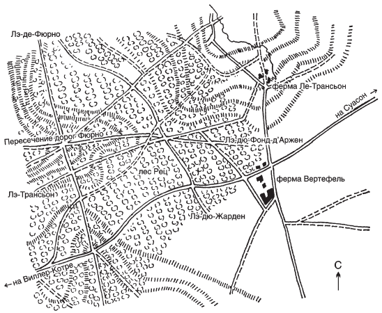 Около 11.00 3 июня поступили донесения о большом числе немцев, пробивавшихся вперед и приближавшихся к ферме Вертефель. К 17.30 того же дня ферма была в руках немецкого пехотного батальона с войсками поддержки, которые при этом занимали позицию по обе стороны дороги Суасон– Виллер-Котре и начали просачиваться небольшими группами в лес несколько юго-западнее фермы. Французский полковой командир передал в распоряжение командира 1-го и 8-го пехотных батальонов два взвода из пяти танков каждый из танковой роты № 1 и два взвода из танковой роты № 2. Остальная часть танкового батальона оставалась в резерве. Лес подвергся весьма незначительному артобстрелу, и многие дороги через него были вполне пригодны для того, чтобы ими могла воспользоваться бронетехника, так же как и местность вокруг фермы. К настоящему времени немцы продемонстрировали, что у них есть окопные минометы и пулеметы, но очень мало артиллерии.