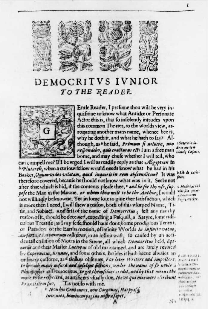 Первая страница введения «Демокрит Младший – читателю». (Издание 1632 года)