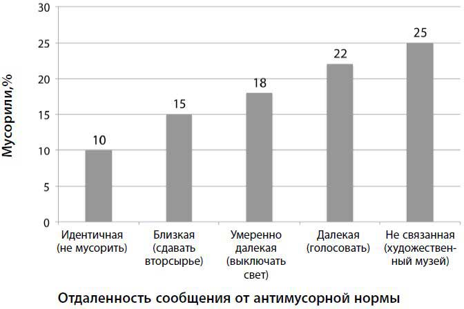 Поведенческий шаблон, который мы наблюдали, был предельно ясен. Сообщение, фокусировавшее людей конкретно на норме «не мусорить» лучше всех активировало их сопротивление склонности намусорить. Но направление их внимания на открывающие концепции, все более далекие от антимусорной нормы, с каждым новым удалением делало их все менее способными противостоять побуждению бросить листок на землю.