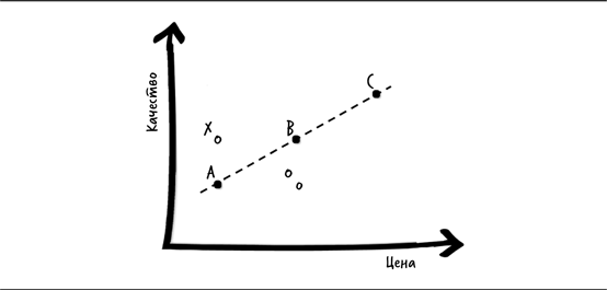 Эти альтернативные компании-претенденты представляют свои новые продукты/бренды, некогда представленные уже A, B и C. Бренд O после выхода на рынок едва ли ждет успех – потребители вскоре поймут, что это предложение ничуть не лучше по качеству, чем бренд А, но стоит дороже, а продукция бренда В при той же цене обладает более высоким качеством. А вот бренд X взлетит, потому что это более качественная версия бренда A при одинаковой цене (или более дешевая версия бренда B, но с сопоставимым качеством). Отметим также, что появление бренда X фактически обессмысливает существование бренда А и вынуждает бренд В изменить свою ценовую политику, потому что бренды С и X образуют новые границы рынка. Этот график позволяет сделать ряд важных выводов, и один из них заключается в том, что бренды рассматриваются с точки зрения критериев, задаваемых самими потребителями, и в итоге получают сравнительную оценку. В вышеописанной рыночной ситуации буквой X обозначено то место, которое стремятся занять большинство компаний.