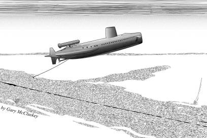 Всё сработало как по маслу. Как только я остановил водолазов на подводном кабеле, они без труда стали подавать трос «Баскетболу», хотя Бобби сказал, что такое ощущение, будто его держат за хвост. Полчаса спустя ребята были у носового якоря и смотрели вверх. Кабель уходил в мутную глубину, и время от времени резко провисал – когда очередная волна сверху делала своё дело с подлодкой.