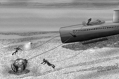 На мониторе я наблюдал, как вытягивается швартов, выбирая слабину подъёмного троса. Когда он натянулся, Гарри сказал Джеру стоп. Я дал знак Командиру, и через пару минут он уже стоял рядом со мной у поста управления погружением.