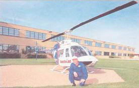 Сидящий на фоне вертолета «Джет Рейнджер» III Джо Рональд Воуэр установил мировой рекорд скорости по кругосветному маршруту (с промежуточными посадками). С 28 июня по 22 июля 1994 г. он на этом вертолете облетел Землю в восточном направлении за 24 дня 4 ч 36 мин. Этот рекорд до сих пор не побит
