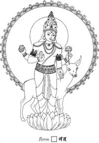 Луна сияет ослепительной белизной йогурта, перламутровой раковины или росы, и вся пища взрастает благодаря этому свету. Он светловолос, юн и удачлив; текучий, словно вода, он то прибывает в теле, то убывает. Миролюбив и приятен наружностью и нравом, он обладает стройными, хотя и округлыми формами тела. Руки и ноги его изящны, глаза прелестны. Он мудр, и речи его умны, кротки и благозвучны. Луна обладает смешанной конституцией капха-вата.Непостоянный, он вечно скитается, нигде не задерживаясь подолгу. По природе своей он вайшья.В теле человека он властвует над кровью; имея природу семени, он полон страсти. Тот, кто ищет любовных наслаждений, должен поклоняться Луне.