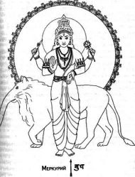 Цвет Меркурия — зелёный, как зелень священной травы дурва[9].Телом он строен и прекрасен, и силы его никогда не идут на убыль. Речь его отчётлива, ясна и сладкозвучна, однако по нраву ему и двусмысленности, и всевозможные каламбуры, и слова с двояким значением. Сердцу его любезны игры, и шутки, и веселье всякого рода. Неизменно благоприятствующий, неизменно хитроумный, он — вайшья (торговец). Велика мудрость Меркурия, и чрезвычайно искусен он в математике и делах торговых. В теле человека властвует он над кожей, рассудком и речью. Его металл — латунь, его драгоценный камень — изумруд. Он обладает смешанной конституцией вата-питта-капха,и ему приятны все вкусы. Повелитель севера, из дней недели он управляет средой, а из созвездий — Девой н Близнецами. Он славен под многими именами — Золотоглазый, Чарующий, Нежный, Знающий и Пробуждающий.