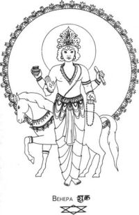 Удачлив и очарователен владыка Венера с красивым упитанным Телом среднего роста, с длинными руками, широкими плечами, мощной грудью и тёмными, короткими, кудрявыми волосами. Мужская сила его не знает себе равных; он умён, и привлекателен, и хорош собой. Он обладает смешанной конституцией капха-вата.Кожа его цветом подобна снегу, белому цветку жасмина или душистого олеандра, или стеблю лотоса. Ему по нраву сочные плоды, и музыка, и женщины. Металл его — серебро, а драгоценный камень — алмаз. И хотя сам владыка Венера имеет лишь один глаз, именно он распоряжается глазами и зрением человека: у кого Венера в гороскопе сильна, у того глаза будут прекрасны.