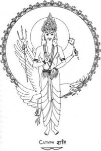 Владыка Шива, довольный жертвоприношениями и аскезой, которой Сатурн предавался на берегах Ранги в Бенаресе, сделал его одним из небесных светил. Но Сатурн не пощадил даже своего благодетеля. Когда у Шивы родился сын Ганеша, мать его Парвати захотела показать мальчика Сатурну. Сатурн учтиво отказался. Однако Парвати настаивала, и Сатурн нехотя взглянул на ребёнка одним глазом. И в тот же миг голова Ганеши обратилась в пепел. Чтобы Парвати в гневе не уничтожила всю Вселенную, владыка Вишну сел на своего орла Гаруду и полетел на север. Там он нашёл слона, изможденного любовными играми со своей подругой, отсек ему голову и, возвратившись с ней назад, приставил эту слоновью голову к телу Ганеши.