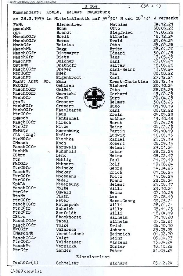 Нойербург использовал увольнения, чтобы покатать своего двухлетнего сына Юргена на яхте и покачать на коленях свою маленькую дочь Ютту. Накануне приемки «U-869» он говорил с братом Фридгельмом. На этот раз он ничего не упомянул о нацистах, он просто посмотрел Фридгельму в глаза и сказал: «Я не вернусь».