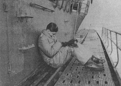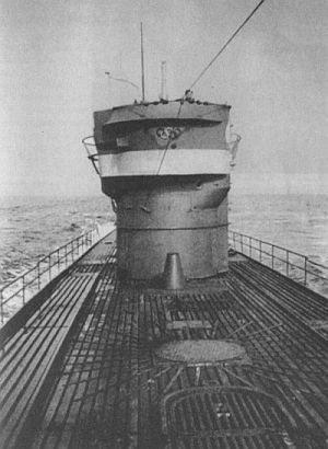 «U-869» в море на учениях. Обратите внимание на олимпийские кольца на боевой рубке, которые обозначают, что субмариной командует выпускник военно-морского училища 1936 года – года проведения берлинской Олимпиады.
