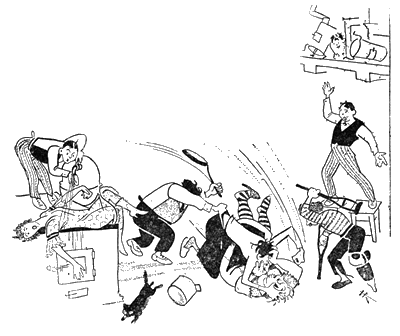 Злополучный котелок с звоном отлетел в угол. Тощая и толстая женщины с артистической ухваткой вцепились друг другу в космы. Носорог, упираясь в плиту ногами, тянул тощую женщину за юбку, пока юбка не осталась у него в руках, в виде трофея. Инвалид, громко ёкая селезенкой, дубасил кого попало. Девица с вытаращенными глазами в истерике билась на плите; один из близнецов отливал ее прямо из-под крана, другой, стоя на табурете, с воодушевлением вопил: