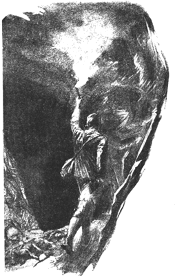 Мак-Куэшчион скатился вниз по склону одной из скал и этим начал свои изыскания. Он поднялся, разбитый и окровавленный, у входа в какую-то пещеру. Казалось, что пещера эта ведет в самое сердце горы. Мак-Куэшчион решил исследовать ее и осторожно вошел внутрь, но не мог пройти далеко, пока не зажег факела.