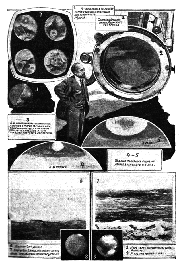 Во втором же случае оба снимка были ясные. Наконец, ученые разрезали оба снимка Марса по линии, проходящей через полюсы, приставили половину первого снимка к половине второго и нашли, что одно изображение гораздо больше другого.