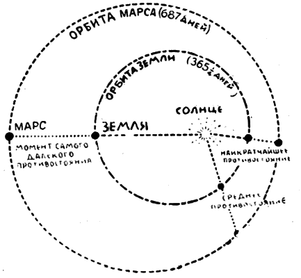 Удобный случай для наблюдений представился астрономам 27 октября 1926 г., когда планета сильно приблизилась к Земле и расстояние между нею и Землей исчислялось всего в 42.630.000 миль. Расстояние это было на несколько миллионов миль больше, чем в августе два года тому назад, когда оно равнялось 35.000.000 миль. Но тогда планета наблюдалась низко на южном горизонте, – положение далеко не благоприятствующее наблюдениям в северном полушарии. Но, несмотря на трудности наблюдений через множество лишних миль земной атмосферы, астрономы окончательно установили два года тому назад что линии каналов существуют в действительности.