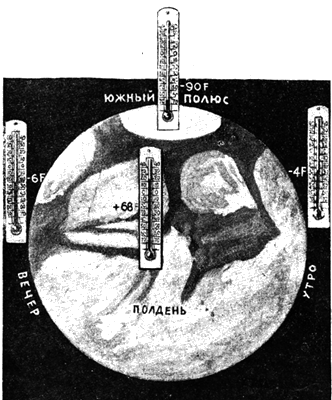 В августе 1924 г., когда производились наблюдения, на южном полюсе Марса было лето, температура все же была девяносто четыре градуса ниже нуля. На большой ледяной шапке, покрывавшей полюс, ясно различались странные светлые пятна, перемены в которых говорили о сильных атмосферных изменениях. Легко можно было наблюдать за процессом таяния.