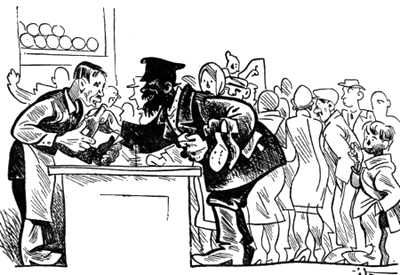 Около двое милиционеров остановились – встретились. Папироски закуривают и разговаривают разговоры. Аким к ним. Хотел о декрете справиться, да не вышло. Только о киперации и спросил. Оба кавалера показали рукой напротив. Глядит Аким: бутылок в окне – конца краю нет и все, видать, с градусами. Решил – с устатку. Зашел внутро. А там гражданская очередь и все с билетиками в руках. Девица на какой-то шарманке щелкает – билетики выдает. Скучно показалось Акиму ждать череду, протискался к прилавку, крикнул отпускающему: