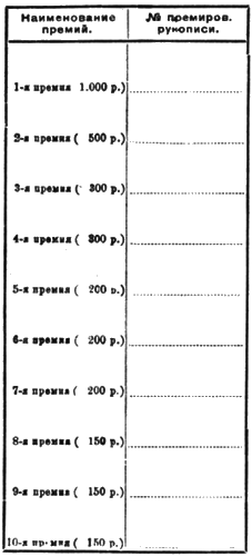 Читателю надлежит заполнить только одну 2-ю графу, четко, без помарок и исправлений, проставив в ней, по своему усмотрению, премированных рассказов, обозначенные крупными цифрами, после заглавия произведений, в 8, 9 и 10 книжках «МИРА ПРИКЛЮЧЕНИЙ».