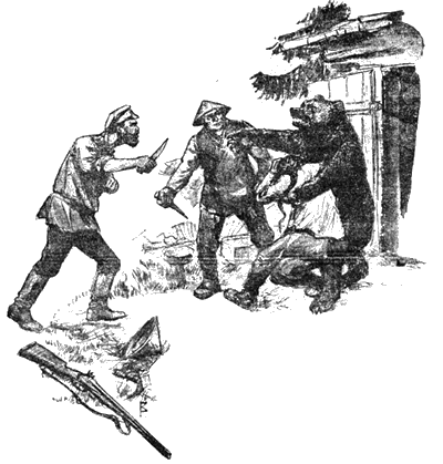 Бывалый Вахромей сразу смекнул в чем дело. Отведя трех груженых лошадей в сторону под прикрытием двух китайцев, он остальных рабочих расставил около окон, а сам с одним китайцем, вооруженным ружьем, стал против двери. По сделанному им знаку, китайцы у окон одновременно завыли дикими, пронзительными голосами, ударяя палками в стены избушки. В избе что-то зашуршало и через минуту в дверь с ревом выскочил средней величины камчатский медведь, весь осыпанный чем-то белым. Грянули два выстрела; мишка взревел еще громче; повидимому, пули царапнули его. Став на задние лапы, свирепо раскрыв красную пасть, он ринулся на приискателей. В одно мгновение он облапил китайца, прижал его к груди так, что у того затрещали кости и, с диким ревом, ринулся на Вахромея, отбежавшего в сторону и поспешно заряжавшего дрожащими руками свое ружьишко. Но заряжать было некогда. Отбросив в сторону ружье, Вахромей вытащил из-за голенища широкий китайский нож и смело двинулся на зверя. Китайцы тоже ринулись на помощь своему соотечественнику. Но медведь, беспрестанно поворачиваясь и, как бы защищаясь еле живым китайцем, находящимся у него в объятиях, медленно отступал в чащу.