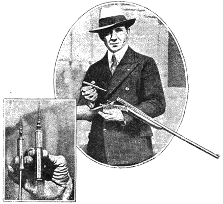 Особенностью этих пуль является небольшая ампула с усыпляющей жидкостью и тонкое, соединенное с ней, пустое внутри острие. Когда такая пуля попадает в тело животного, жидкость быстро распространяется по кровеносной системе, и животное погружается в глубокий сон – столбняк. Этим самым делаются излишними сложные западни-ловушки – сонное животное связывают и кладут в клетку. Действие усыпительной пули сказывается и тогда, когда ею наносится даже самое легкое ранение Чего доброго – скоро кто-нибудь додумается до таких же «гуманных пуль», которые будут усыплять солдат противника, выводя его из строя во время сражения и лишая его возможности вернуться туда впродолжение более или менее значительного времени…