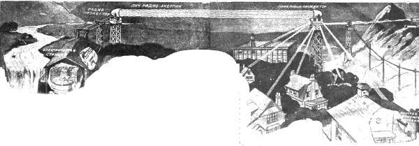 На левом рисунке видно, как будет обстоять дело с передачей энергии. Слева – энергия гидроэлектрическ. станции превращается в колебания большой частоты и посылается радио-прожектором в виде узкого пучка невидимых для глаза лучей. Справа, на высокой башне виден такой же приемник, от него по разным направлениям расходятся радио-лучи меньшей силы, воспринимаемые небольшими антеннами внутри домов и заводов. Справа же видна небольшая передаточная станция, превращающая радио-волны в обычный электрический ток. идущий по проводам.