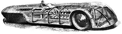 В погоне за рекордами быстроты одна из американских автомобильных фирм (Санбим) построила недавно чрезвычайно интересную машину, наделавшую много шуму (в буквальном и переносном значении этого слова) в спортивных заграничных кругах. Строившиеся до сих пор машины обладали мотором самое большее 500–600 сил, при чем, как общее правило, мотор ставился впереди. Фирма Санбим, при постройке своей рекордной машины, носящей интригующее имя «Тайна С», поставила целых два мотора по 500 сил– один спереди, другой – позади шоффера. На приведенном рисунке видно устройство этой машины. Бросается в глаза низкое расположение всех частей и острые концы корпуса. Такое низкое расположение обычно уменьшает опасное раскачивание автомобиля при больших скоростях, а острые концы устроены с целью уменьшения лобового воздушного сопротивления. Летом это чудовище на колесах было испытано впервые известным автомобилистом Сигревом на плотном песочном пляже в Дайтоне. В результате этих испытаний удалось довести скорость автомобиля до 327 километров в час (конечно, на коротком расстоянии в несколько километров) и тем самым оставить далеко позади все прежние рекорды быстроты, не превосходившие 300 километров в час. В практической жизни такие скорости, конечно, не имеют значения, так как они достижимы только на специально подготовленных и совершенно свободных дорогах, но как показатель высокого мастерства современного автостроения, последний рекорд несомненно весьма характерен.