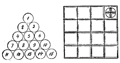 На рис. 1-м изображена пирамида из биллардных шаров (1—15). Попытайтесь шары эти сложить в биллиардный ящик (рис. 2-й), но с таким расчетом, чтобы схема очков в каждом из горизонтальных (4), вертикальных. (4) и диагональных (2) рядов его равнялась одному и тому же числу, – какому именно?.. (См. стр. 80).