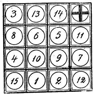 Сумма чисел каждою из вертикальных, горизонтальных и диагональных рядов равна 30 (1 + 2 + 3 +…. 15 + 4), и располагаются шары в ящике порядком, указанным на чертеже.