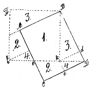 Так как в данном прямоугольнике стороны АВ и CD относятся к сторонам АС и BD, как 4 к 5, то, разделив сторону CD на 2 равных части, а сторону BD – на 5 равных частей, из точек с и d восставляем перпендикуляры до пересечения их в точке К. Далее тремя (минимум) разрезами по прямым линиям eD, Bk и ck делим прямоугольник на 4 части (АВке, Сеkс, BDk и ckD), из которых и складываем квадрат EFBk, что ясно видно из чертежа.