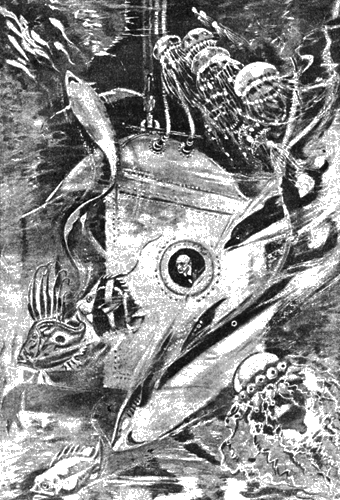 Комнатка наша, действительно, была очень уютной, и я удивлялся искусству и предусмотрительности, с которыми все это было устроено. Электрический свет не был зажжен, но полутропическое солнце ярко светило в каждое оконное отверстие через бутылочно-зеленую воду. Тут и там мелькали маленькие рыбки и качались серебряными черточками на зеленом фоне. Кругом маленькой комнаты находился диван, над которым были расположены измеритель глубины, термометр и другие инструменты. Под диваном был ряд трубок, которые представляли наш запас сгущенного воздуха на случай, если нам изменят воздушные трубы. Эти трубы открывались над нашими головами и рядом висел телефонный аппарат. Нам был слышен похоронный голос капитана, говорившего снаружи: