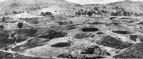 Наружный вид города троглодитов с 12.000 населением в Матмате. Это – громадная долина, изрытая, как видно на фотографии, гигантскими колодцами – жилищами людей.