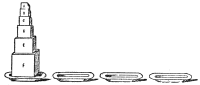 На одном из четырех блюд поставлены один на другом 6 уменьшающихся по размерам кубиков, А, В, С, Д, Е, F. Требуется все кубики в том же порядке, пользуясь запасными блюдами, установить на второе блюдо, соблюдая два правила: переносить кубики можно лишь по одному и не ставить больший над меньшим. Требуется определить наименьшее число и порядок необходимых перестановок (см. стр. 56).