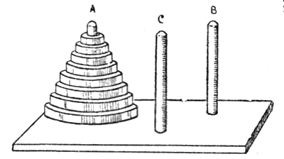 Предыдущая задача не что иное, как упрощение одной индусской задачи. Задача эта настолько любопытна, что для ее решения стоит потратить немного времени. Вырезав из картона 8 небольших, постепенно уменьшающихся кружочков с отверстием посередине, надо взять кусок картона или небольшую дощечку и укрепить в ней три палочки высотой в несколько сантиметров (см. рис. внизу). Палочки эти обозначим буквами А, В, С. Наденем на палочку А наши картонные кружки, составив из них пирамиду. Теперь требуется с палочки А перенести всю пирамиду на палочку В. пользуясь, как вспомогательной, третьей палочкой С, при чем зараз можно переносить лишь один кружок и класть его или на свободную палочку, или на кружок большего размера. Вместо кружечков и палочек можно взять восемь карт, начиная от туза до восьмерки, и перекладывать их по одной, не закрывая меньшее число очков большим (см. стр. 56).