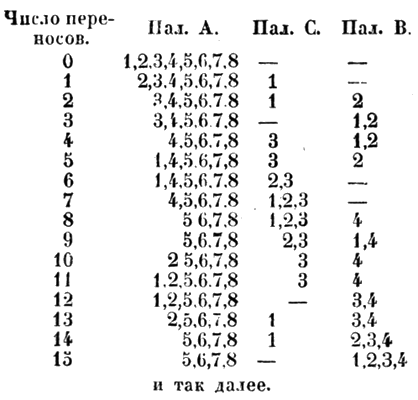 Как общее правило, можно заметить, что на вспомогательную палочку С, когда она свободна, надеваются лишь нечетные кружки, а на В – при этом только четные. На перестановку двух кружков надо было сделать три переноса, для перестановки трех – семь переносов, для перестановки четырех – пятнадцать переносов, а вообще для перестановки и кружков надо совершить 2n —1 переносов В нашей задаче с восемью кружками надо, таким образом, сделать 28—1, или 255 переносов.