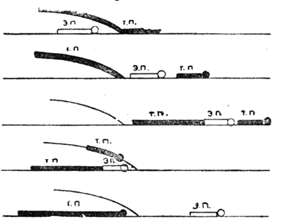 Товарный поезд помещают насколько возможно на запасную ветку и отцепляют паровоз с частью вагонов, оставшихся на главном пути. Приходит экстренный поезд. В чем дело? Начальник полустанка рапортует. – Ага, отлично! Экстренный медленно проходит мимо ветки, осаживает назад, зацепляет товарные вагоны с запасной ветки и выводит их на главный путь, очутясь таким образом между головой и хвостом товарного. Затем экстренный поезд, толкая хвост товарного, дает задний ход и снова минует стрелку, куда немедленно задним ходом въезжает передняя часть товарного поезда. Экстренный расцепляется с товарным, дает свисток и несется дальше, а паровоз товарного с передней частью поезда снова въезжает на главный путь, прицепляют задние, слева стоящие вагоны и продолжает свои маршрут.