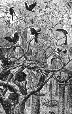 Юноша-папуас, стоящий у подножия высокого дерева, бьет птицу за птицей, собирая их, когда они падают с ветвей. Охотник тут, главным образом, конечно, старается не попортить прекрасное оперенье.
