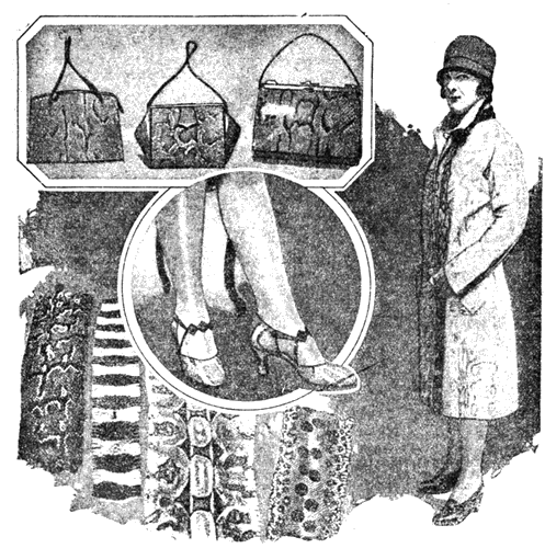 Сверху – сумочки из змеиной кожи; справа – модница в пальто из змеиной кожи: посредине «змеиные туфли»; снизу – образцы выдубленой кожи разных пород змей.