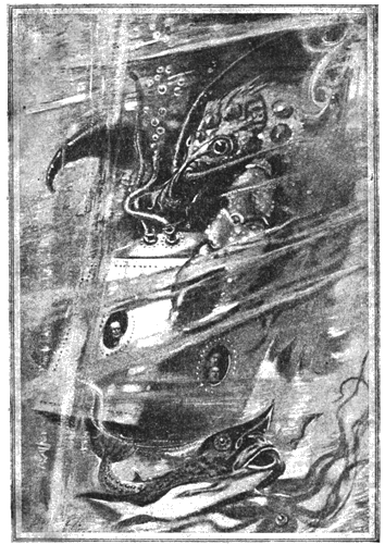 Мы медленно двинулись вперед через край бездны. Темнота не спасла нас от атак, и мы снова зажгли наши огни. Один из иллюминаторов был совершенно затемнен тем, что оказалось нижней частью живота страшного существа. Его голова и клешни работали над нашей крышей и мы продолжали раскачиваться, как звонящий колокол. Сила животного должна была быть огромной.
