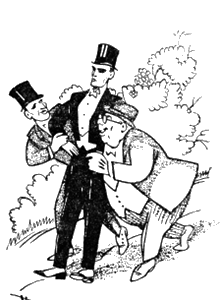 За поворотом ясно слышен нарастающий гул автомобиля. Напряжение достигает высочайшей степени. Еще минута, еще секунда, и вылетевший автомобиль кинется на одну из дорог и раздавит героического дуэлянта во фраке и цилиндре. Но кого? Которого?