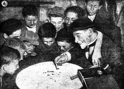 Размеры цирка, конечно, соответствуют размерам артистов. Венский цирк блох – не велик. Он вмещает не больше пятидесяти человек. Деревянные скамьи расположены амфитеатром, окружая с трех сторон самую арену. Это небольшой стол, на котором лежит круглый лист белого картона в высокой рамке красного бархата (снм. 4). С четвертой стороны стола находится укротитель и около него – «уборные артистов» и «помещение для реквизита» – все в сигарной коробке. А позади – стоячие места, человек на десять.