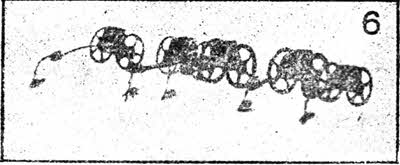 Открывается представление маленькой лекцией укротителя. Она начинается со сведений, взятых из энциклопедии, и рассказом о том, как трудно воспитать блоху. Затем зрителям передается лупа, к которой прикреплена только что пойманная блоха, бьющаяся на своем медном ошейнике. Укротитель обращает внимание публики на все анатомические особенности обыкновенной блохи, чтобы сравнить ее затем с натренированной блохой-артисткой. Укротитель подчеркивает, что блохи немы, не поют и не говорят, а, следовательно, они– «артисты», а не «актеры». Они производят на зрителя впечатление мимикой, выразительными движениями и поражающей силой мускулов. Из «конюшни» (т. е. из ящичка извлекается с помощью тоненького пинцета экипаж с упряжью. Это крошечная, в два сантиметра длиною, карета из латуни (снм. 5). Ее везет хорошо откормленная, полнокровная блоха. Она шутя тянет карету и не шагом, а быстрым аллюром. Кто из нас, людей, смог бы тащить, да еще так легко, тяжесть в двести раз большую, чем наше тело, и размерами в десять раз длиннее его? За каретой следует телега, в которую из предосторожности впряжены две блохи. Ведь, не знаешь, какие на телегу могут взвалить тяжести! Третья блоха тянет каток для укатывания мостовой. Вслед за этим у старта – линии, проведенной карандашем, – появляется пять конкурренток – беговых блох, запряженных в «беговые дрожки». Они быстрым бегом достигают цели, – другой черты, также проведенной карандашем (снм. 6).