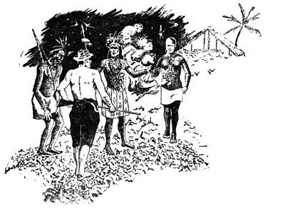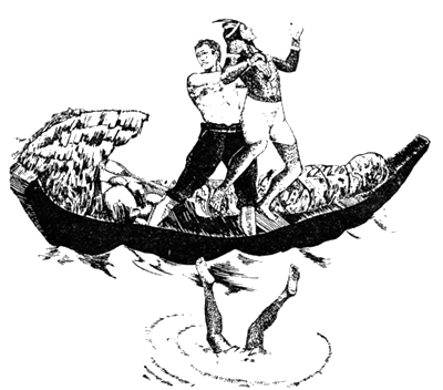 Однако, уже через несколько часов прибрежные деревья превратились, казалось, в какие-то безумные луки. Посыпался дождь пестро оперенных стрел всевозможного вида, падавших с легким шипением и, в виде каких-то мертвых, попугаев, уносившихся вниз по течению. Симсон, съежившись под разодранной крышей из пальмовых веток, охваченный отчаянием, греб изо всех сил, прислонив к груди труп жены, который, как щит, принимал в себя все стрелы…