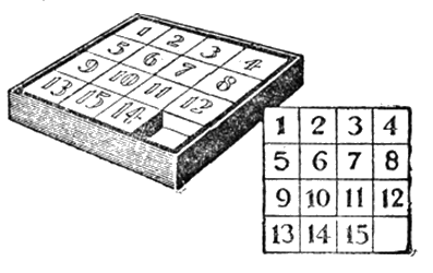 Возьмите небольшой ящичек или еще проще – вырежьте в листе толстого картона квадратное отверстие 4 × 4 дм. и подклейте его снизу другим листом картона. Вырезанный квадрат разделите и разрежьте на 16 маленьких квадратов, на которых затем напишите цифры от единицы до 16. Вложите эти квадратики по порядку цифр в сделанную рамку, оставив последнюю клетку с цифрой 16 пустой, и переставьте 14 и 15 квадрат один на место другого (см. рис. слева). Затем попробуйте, передвигая (но не поднимая!) квадратики, расположить их в нормальном порядке, т. е. № 15 заменить № 14 (рис. справа). Задача как будто проста, но посмотрим, сколько времени она у вас возьмет.