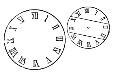 Перед нами циферблат часов, справа он разделен на 3 куска, при чем сумма цифр в каждом раина 26. Попробуйте разделить левый циферблат на четыре куска так, чтобы сумма цифр в каждом была равна двадцати (Реш. см. стр. 80).