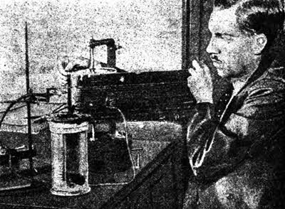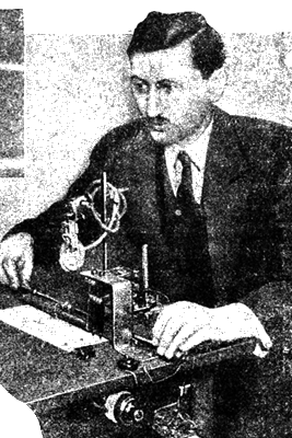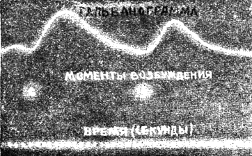 Другой не менее интересный способ, обнаруживающий незаметные душевные волнения, основан на одном наблюдении, сделанном французским доктором Шарлем Фере еще в 1887 году. Этот ученый нашел, что сопротивление, оказываемое прохождению электрического тока поверхностью нашей кожи меняется в зависимости от наших душевных эмоций: страха, смущения, испуга и т. д. Эти явления были использованы одним нью-иоркским психологом д-ром Д. Векслером, изображенным вместе с изобретенным им прибором на рис. 2. Испытуемый субъект (рис. 3) садится в кресло и кладет свою руку на подставку, погружая при этом два пальца в небольшие стекляные сосуды с соляным раствором, через которые пропускается слабый электрический ток. Пока испытуемый человек сидит спокойно, зеркальце гальваноскопа чертит на бумаге ровную линию, но стоит ему хотя немного разволноваться, или испугаться, как гальванограмма дает резкий скачек (рис. 4). Чем больше субъект будет стараться сохранить спокойствие, тем менее это ему удастся и тем больше будет эффект опыта. Прибор этот, по справедливости, может быть назван «правдомером»…