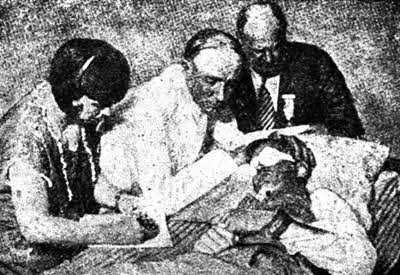 Д-р Хоуз, работающий в Техасе, предложил еще более любопытный способ для проверки правдивости судебных показаний. Он впрыскивал испытуемым субъектам раствор одного алколоида – скополамина, обладающего свойством ослаблять некоторые задерживающие мозговые центры. Человек, которому впрыснут эту «сыворотку истины», как ее назвал д-р Хоуз, теряет контроль над св им зрением и речью: глаза не могут сосредоточиться на одном предмете, наступает полудремотное состояние и испытуемый совершенно непроизвольно выбалтывает то, что у него на уме. Через некоторое время действие скополамина прекращается и субъект приходит в себя. На рисунке 5 изображен момент такого допроса: арестованный лежит, руки у него связаны наручниками, глаза закрыты повязкой, т. к. скополамин, подобно белладоне, производит расширение зрачков. Над ним склонились полицейский агент, доктор и стенографистка, записывающая невольные признания преступника. По способу Хоуза будто бы удалось уже доказать невиновность заподозренных в нескольких случаях. Так например, во время одного налета, сопровождавшегося убийством двух полицейских, был арестован юноша, упорно отрицавший свою вину и утверждавший, что он не знал, на что вели его скрывшиеся товарищи, совершившие убийство. Доказательств этому никаких не имелось и бедняге грозил электрический стул, если бы не способ Хоуза, благодаря которому удалось выяснить, что юноша не лжет. Три американских журналиста добровольно, предложили произвести над ними опыт действия скополамина, при чем нарочно условились говорить неправду. Попытка их кончилась полной неудачен, так как, под влиянием скополамина, они, помимо своей воли, все-таки не могли солгать…