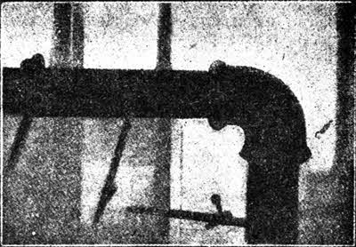 Действие этого аппарата чрезвычайно просто. Аппарат соединяют со штепселем электрической проводки в доме и направляют, как прожектор, на исследуемый участок стены. По другую ее сторону (см. рис. 1) находится исследователь, который ловит лучи рентгена на флуоресцирующий специальный экран, заключенный в конусообразной коробке с отверстием для глаз. Если между экраном и аппаратом в стене придутся какие-нибудь металлические части, то последние дадут на экране свою отчетливую черную тень (рис. 2).