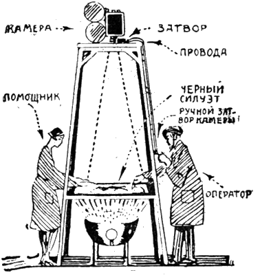 Теперь и в этой области введена немалая доля механизации. Фигуры не рисуются, а вырезываются из картона, при чем им придается в сочленениях известная подвижность – вроде, как у картонных плясунов (см. рис. 1). Затем на матовой прозрачной бумаге рисуют фон, укрепляют его на горизонтальном стекле, а поверх бумаги кладут вырезанные картонные фигуры. Стекло освещают сильным источником света снизу (см. рис. 2), а съемку производят специальной камерой, установленной сверху. Для каждого снимка оператор незначительно меняет (см. рис. 3) положение движущейся фигуры и только тогда нажимает имеющийся у него под рукой затвор фотографической камеры. Так, снимок за снимком, получаются отдельные сцены и целые весьма художественные кино-картины, вроде последней германской силуэтной фильмы «История принца Ахмета», потребовавшей около 3 лет упорного труда и 250.000 отдельных снимков.
